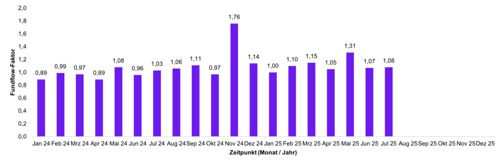 Veränderungen der Mittelzuflüsse und Mittelabflüsse werden über den Fundflow-Faktor ausgedrückt. Dabei werden die monatlichen Mittelzuflüsse des Berichtszeitraums in Relation zu den monatlichen Mittelabflüssen gesetzt. Bei einem Fundflow-Faktor über eins überwiegen die Mittelzuflüsse, bei einem Fundflow-Faktor unter eins die Mittelabflüsse.