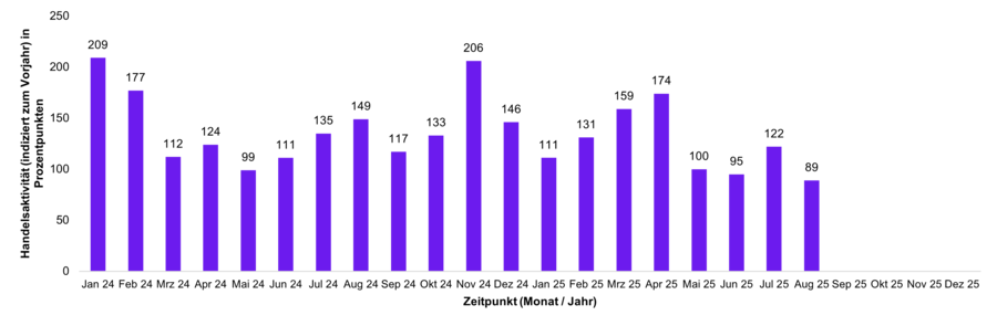 Die Handelsaktivität basiert auf dem Handelsvolumen und lässt unmittelbare Rückschlüsse auf den aktuellen Jahrestrend im Handel mit ETFs bei Kunden der FNZ Bank zu. Ein Wert von über 100 steht für eine überdurchschnittliche Handelsaktivität der Kunden im Vergleich zum mittleren monatlichen Handelsvolumen des Vorjahres; ein Stand unter 100 zeigt eine unterdurchschnittliche Handelsaktivität an.