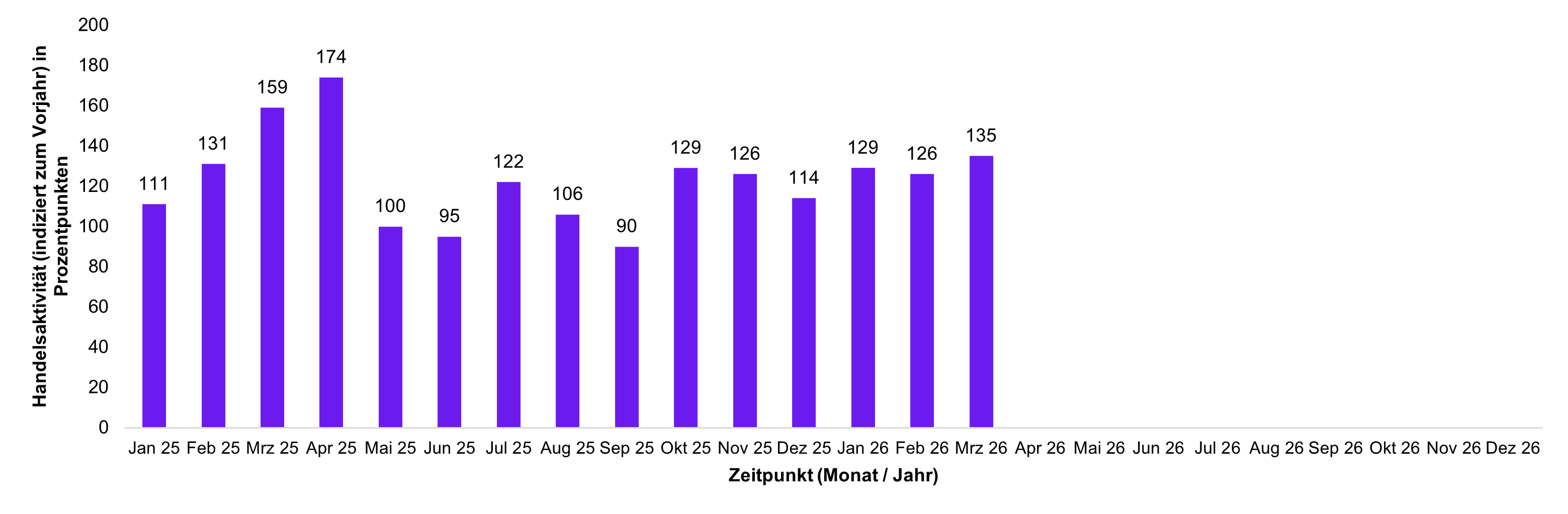 Die Handelsaktivität basiert auf dem Handelsvolumen und lässt unmittelbare Rückschlüsse auf den aktuellen Jahrestrend im Handel mit ETFs bei Kunden der FNZ Bank zu. Ein Wert von über 100 steht für eine überdurchschnittliche Handelsaktivität der Kunden im Vergleich zum mittleren monatlichen Handelsvolumen des Vorjahres; ein Stand unter 100 zeigt eine unterdurchschnittliche Handelsaktivität an.