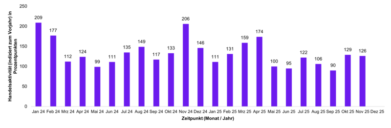 Die Handelsaktivität basiert auf dem Handelsvolumen und lässt unmittelbare Rückschlüsse auf den aktuellen Jahrestrend im Handel mit ETFs bei Kunden der FNZ Bank zu. Ein Wert von über 100 steht für eine überdurchschnittliche Handelsaktivität der Kunden im Vergleich zum mittleren monatlichen Handelsvolumen des Vorjahres; ein Stand unter 100 zeigt eine unterdurchschnittliche Handelsaktivität an.